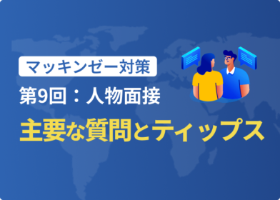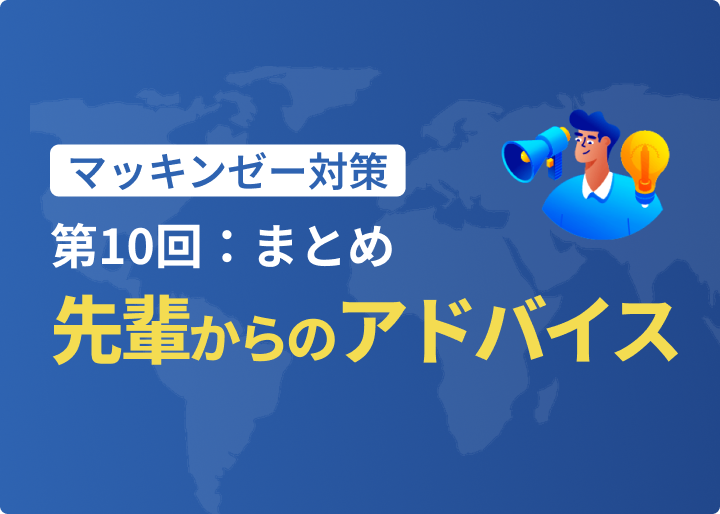 (今後の掲載予定)第1回【概要】選考の流れと夏冬の特徴第2回【全般】問題解決の思考プロセスの重要性第3回【ケース面接】網羅構造の注意点第4回【ケース面接】網羅構造とフレームワーク第5回【ケース面接】網羅構造の思考法第6回【ケース面接】図表読み取り第7回【ケース面接】計算問題と財務知識第8回【人物面接】マッキンゼーの求めるリーダーシップと人物面接の重要性第9回【人物面接】主要な質問とティップス第10回【まとめ】先輩からのアドバイス