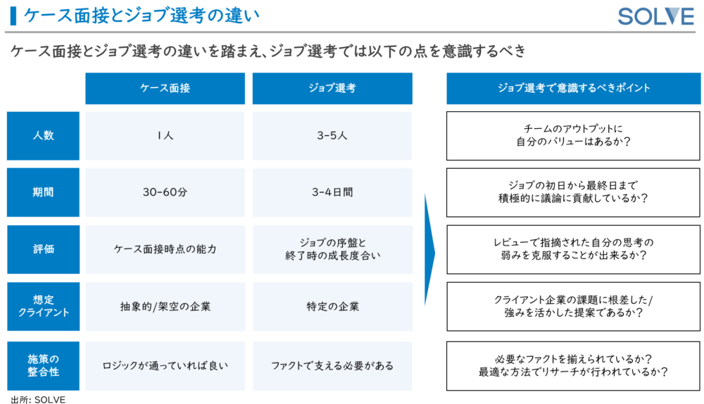 いよいよサマージョブの季節が近づいてきましたね。ジョブ選考は、これまで皆さんが受けてきたケース面接とはかなり趣向が異なりますので、頭の切り替え、行動の切り替えが必要になります。