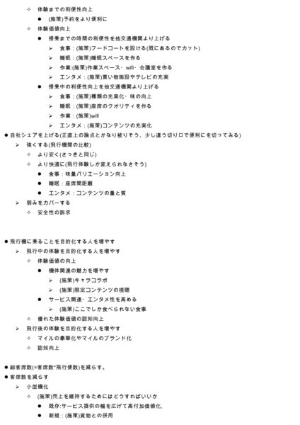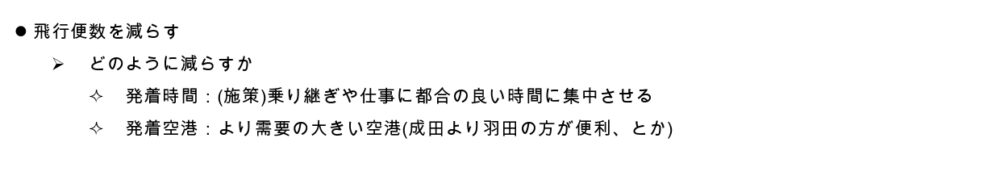 客席稼働率=利用者数/総客席数(=客席数飛行便数)で定義される。 よって、考える方向性として、 1)利用者数を増やす2)総客席数(=客席数飛行便数)を減らす。(この場合、どのようにして売上をkeepするか、や、他の売上向上施策も考えたい。)